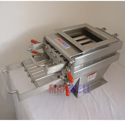 麦克斯威尔公司专利产品:易清理箱式格栅除铁器采用超强磁棒与特殊抽屉式拉门组合,无需操作人员一根根清理磁棒,只需像打开和关闭抽屉一样,拉和推,就可以一次性清除所有磁棒上吸附的铁杂,大大提高效率和降低工人劳动强度,由于清理便捷,可以根据实际生产情况,增加卸铁次数,避免磁棒吸附的铁杂质过于饱和,以便最大发挥设备的除铁效能。独特的磁棒刮环可以循环使用,刮去杂铁。杂铁落到与产品流区域分开的卸杂口区域,可以使用料袋收集,避免二次污染物料。